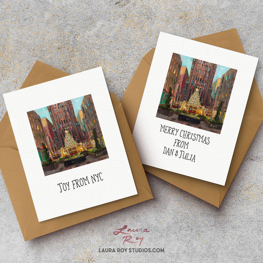 Personalized NYC Rockefeller Christmas Tree Card – Oil Painting of Rockefeller Center Tree at Dawn, Customizable Holiday Greeting (Single or Set)