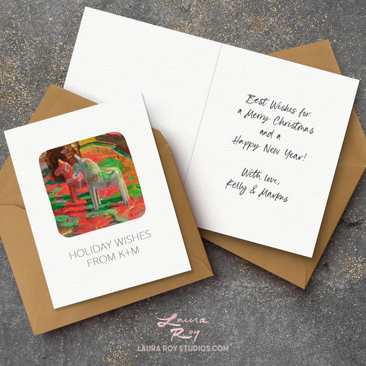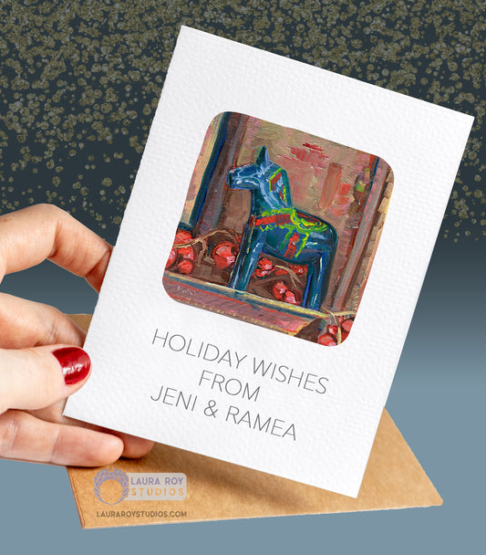 Personalized Blue Dala Horse Holiday Card - Painterly Oil Artwork with Red Ornaments, Customizable Greeting (Single or Set)