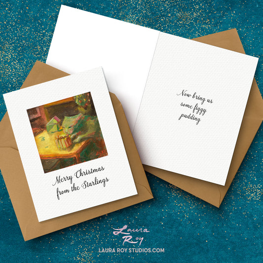 Personalized Festive Mischief Holiday Card - Quirky Oil Painting of Cat or Creature with Cake, Customizable Greeting (Single or Set)