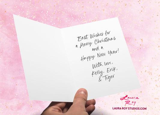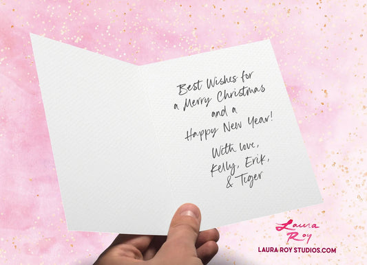Personalized Christmas Tree with Cat - Cozy Watercolor Holiday Scene with Gifts and Cat, Customizable Greeting (Single or Set)