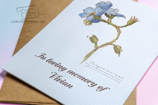 Personalized Forget-Me-Not Sympathy/Get-Well/Birthday Card - Elegant Watercolor Art with Memorial Tribute (Single or Set)
