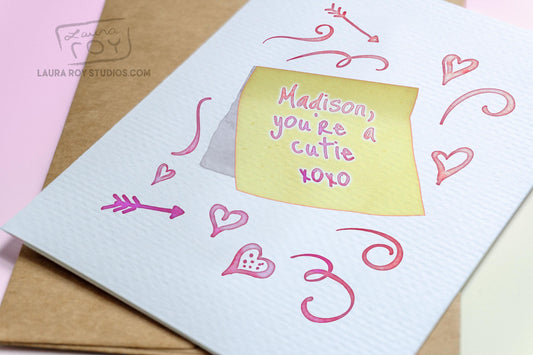 Personalized Sticky Note Watercolor with Hearts Card - Cute Sketches with Custom Messages for Valentine's Day (Single or Set)