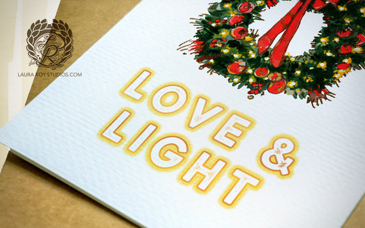 Personalized Quirky Flocked Wreath Card: Watercolor Wreath with Ornaments and Dinosaurs, Customizable Holiday Greeting (Single or Set)