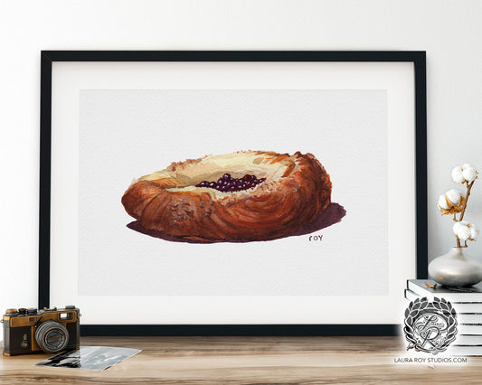 • Almond Croissant Watercolor Print – Bear Claw Pastry Food Art, Flaky French Bakery Decor, Kitchen Giclée Print, Foodie Gift