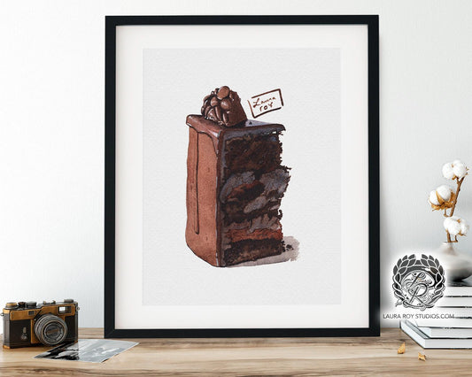 • Chocolate Cake Slice Watercolor Art Print  Decadent Dessert Illustration, Bakery Wall Art