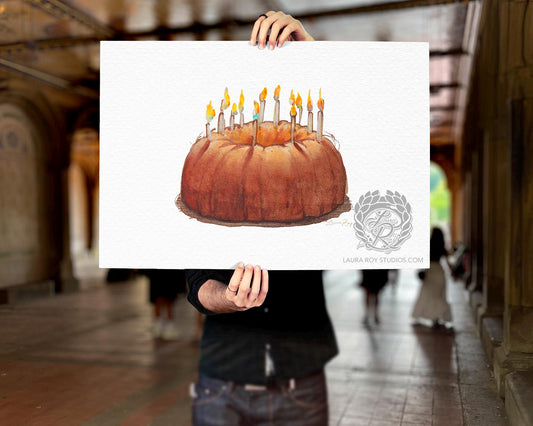 Watercolor Pound Cake Birthday Art Print Whimsical Cake Illustration with Candles, Celebration Kitchen Decor