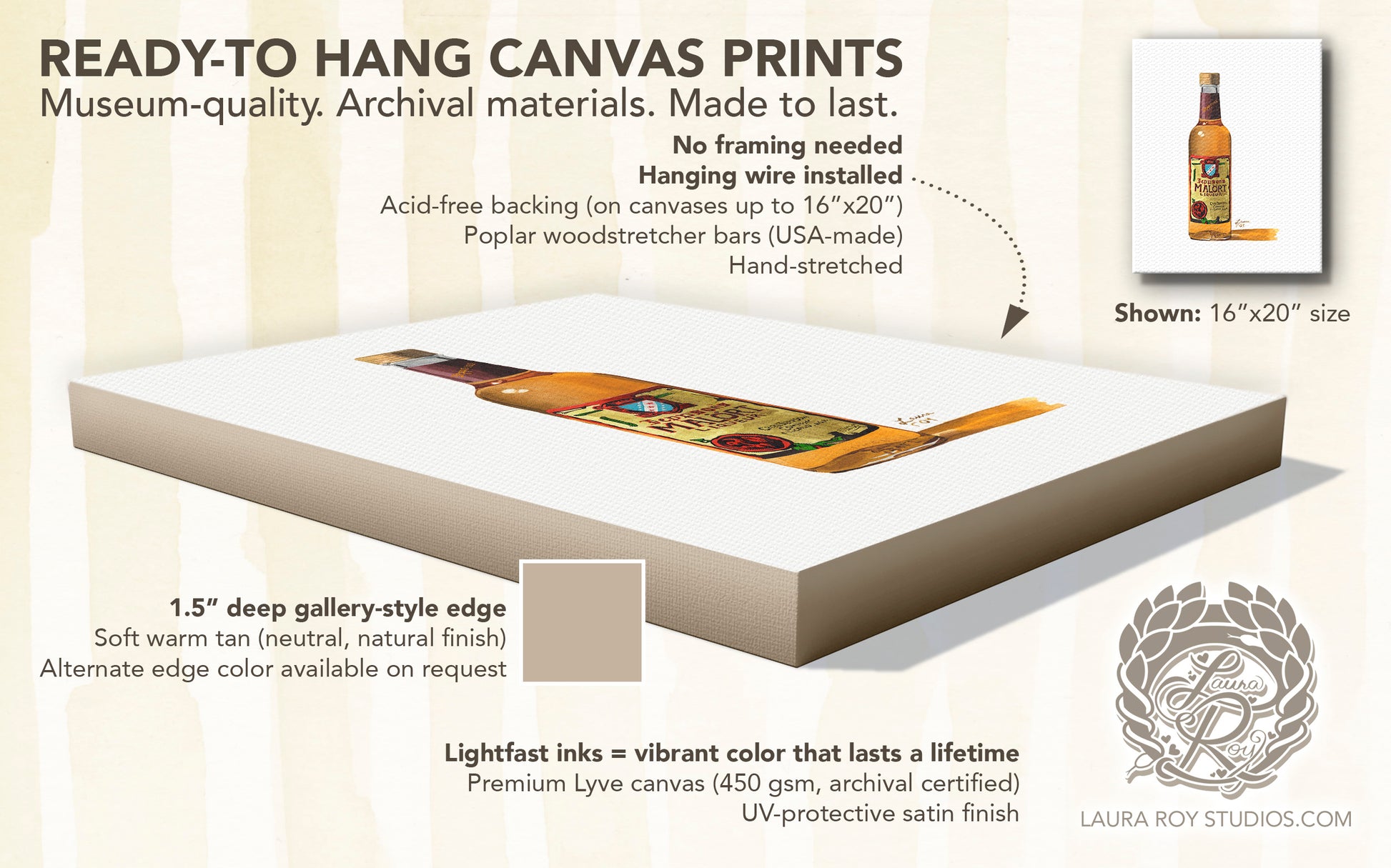 - Stretched canvas (ready to hang with wire backing), hand-stretched on 1.5-inch bars with a UV-protective satin finish and warm tan edges