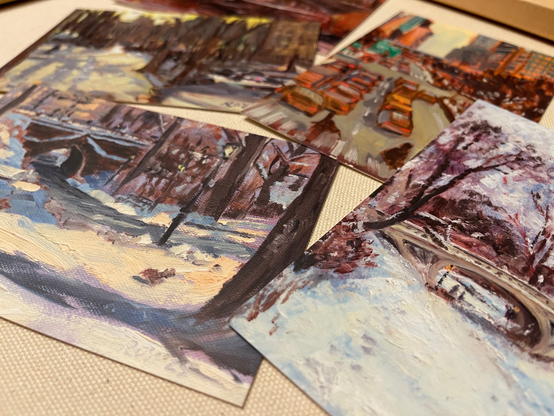 Each 4x6” postcard is printed from Laura Roy’s original artwork, capturing the city’s changing light, hidden corners, and iconic moments.