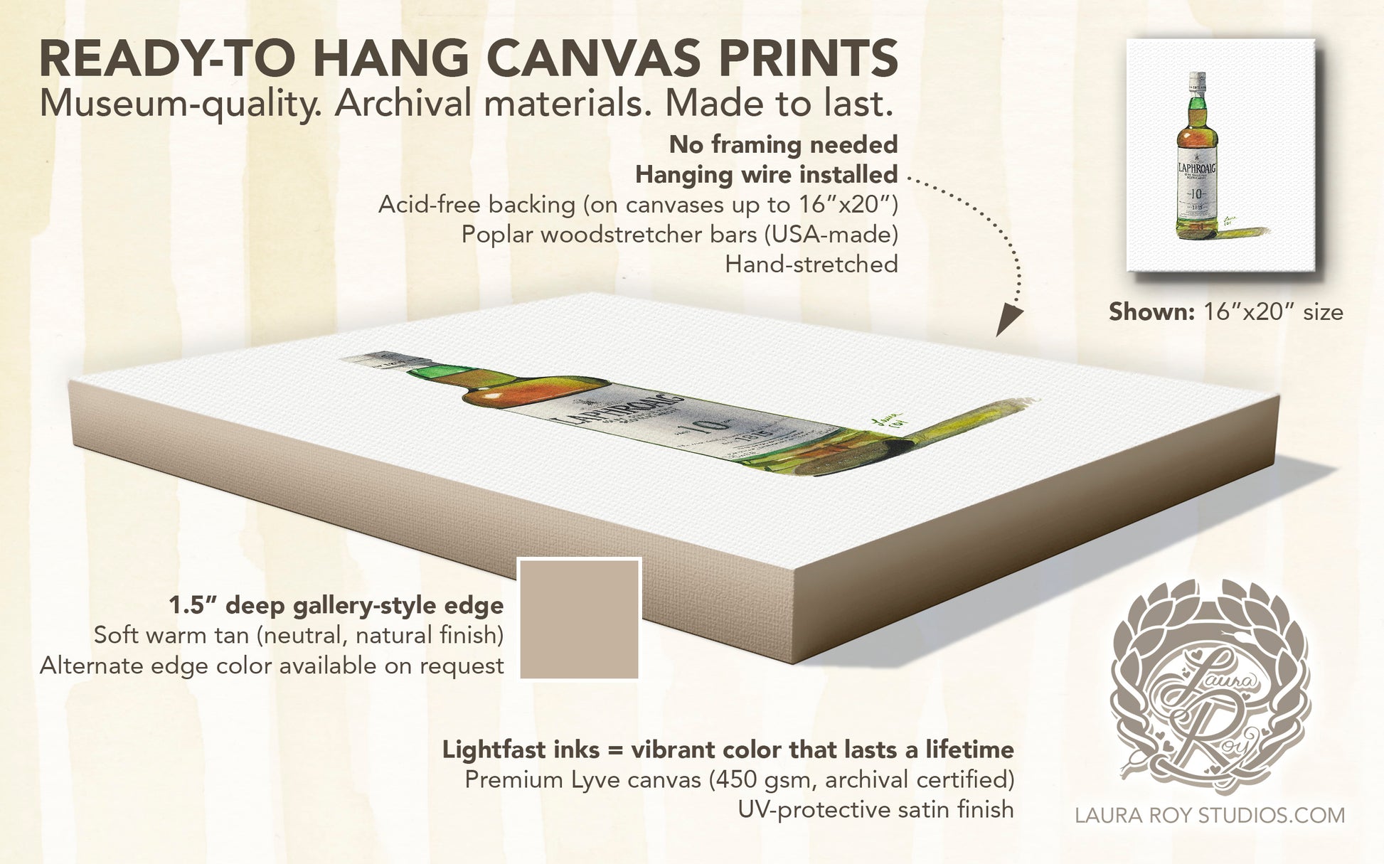 - Stretched canvas (ready to hang with wire backing), hand-stretched on 1.5-inch bars with a UV-protective satin finish and warm tan edges