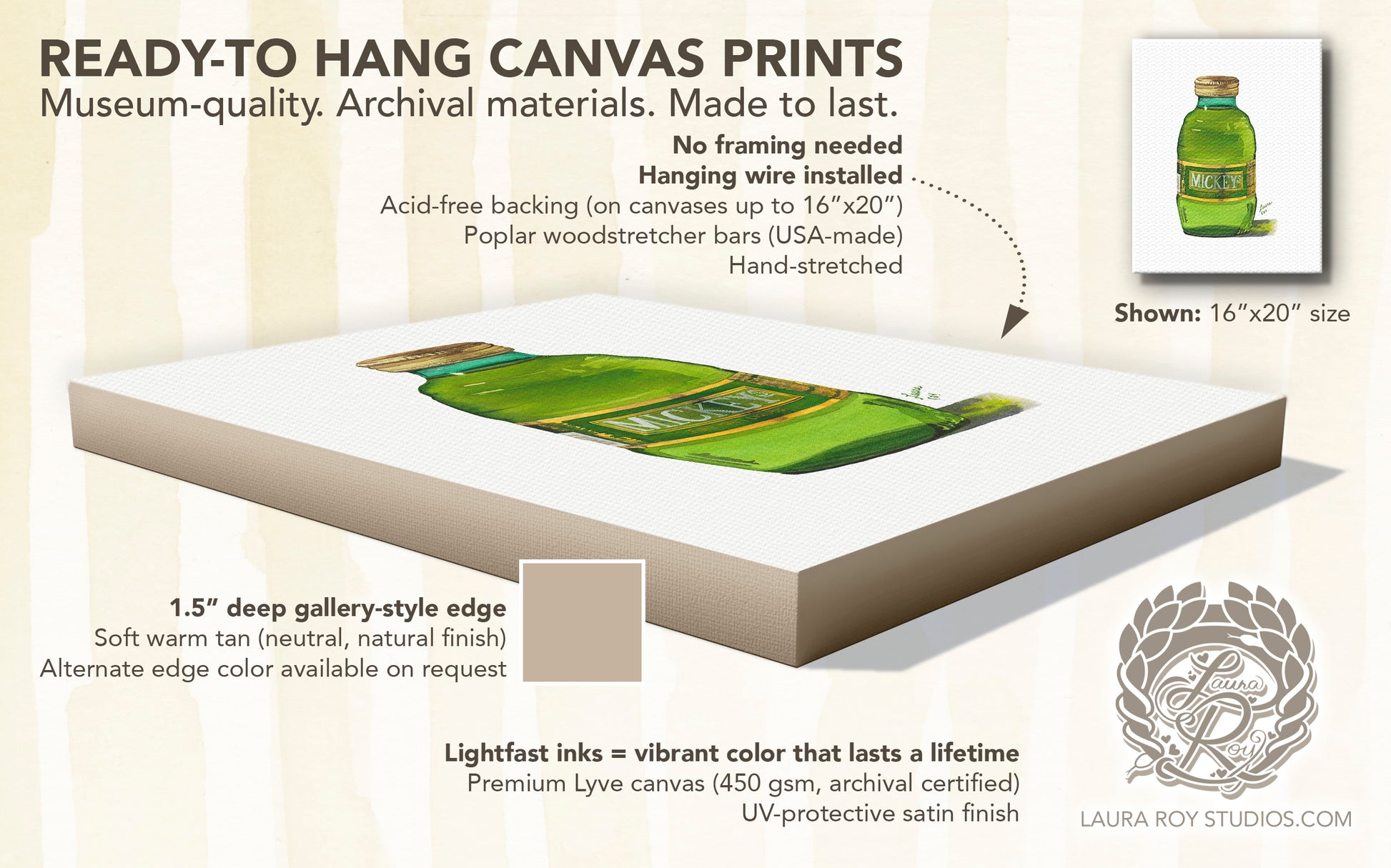 - Stretched canvas (ready to hang with wire backing), hand-stretched on 1.5-inch bars with a UV-protective satin finish and warm tan edges