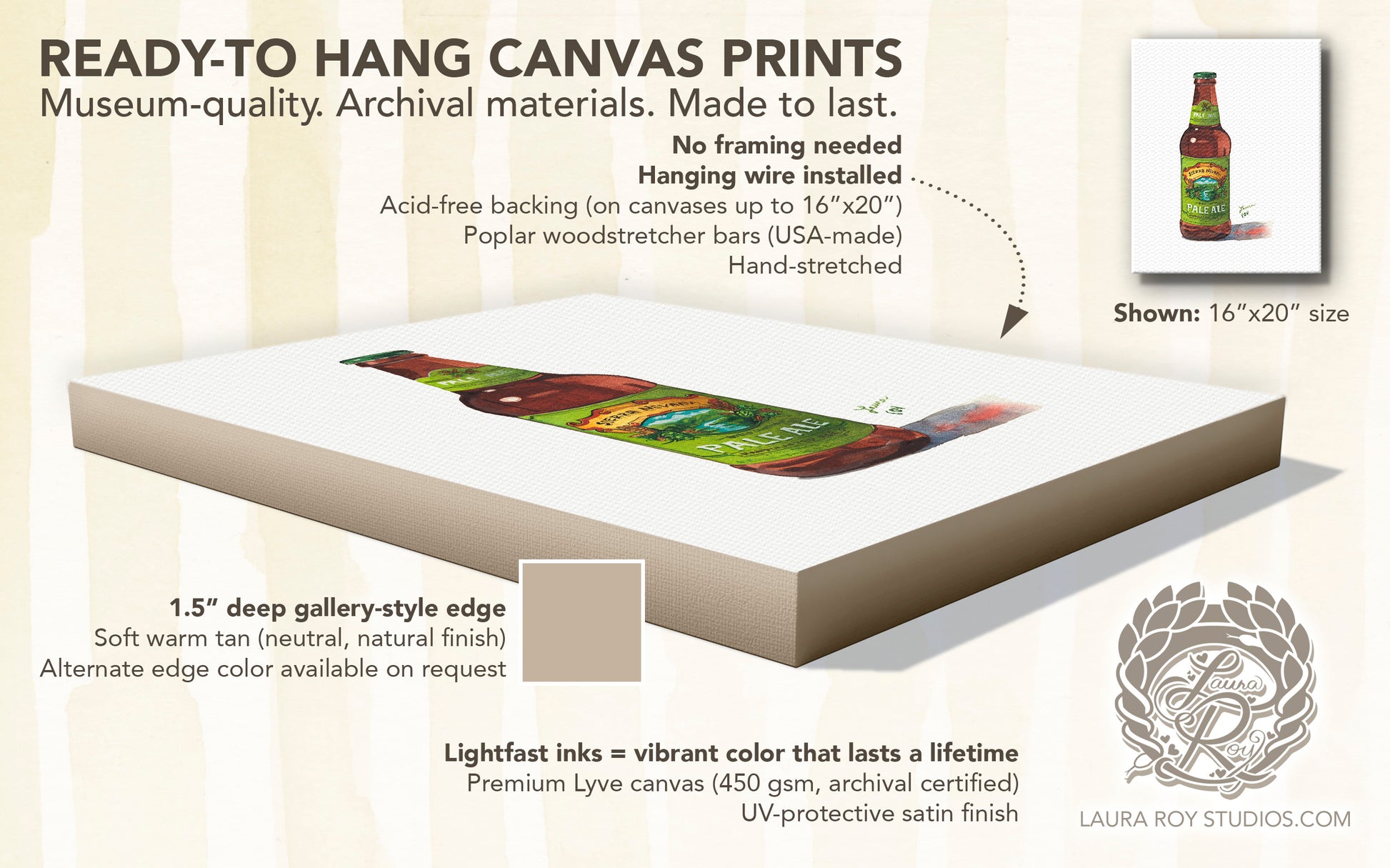 - Stretched canvas (ready to hang with wire backing), hand-stretched on 1.5-inch bars with a UV-protective satin finish and warm tan edges