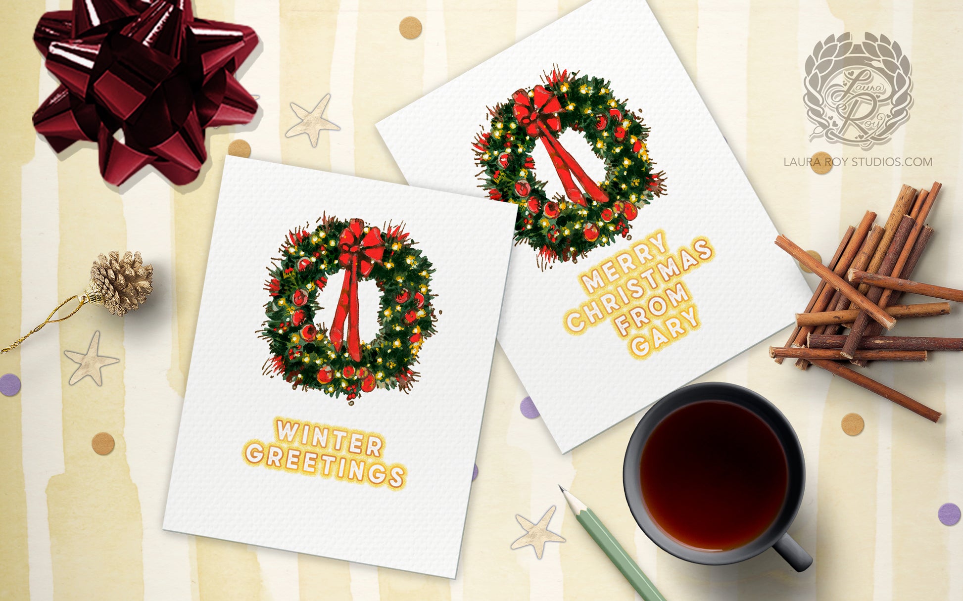 - Laura's Art: This card showcases my artwork of my own Mom's wreath, blending festive tradition with a touch of fun and elegance.